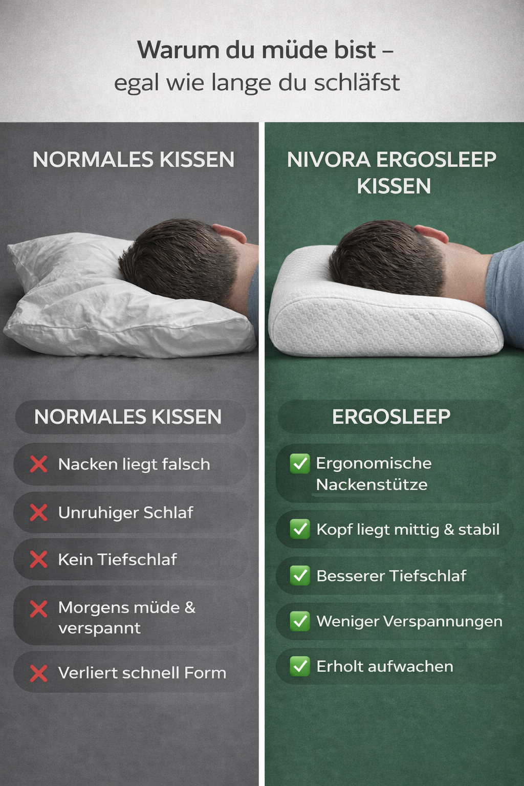 Viele Menschen schlafen, ohne es zu wissen, in einer ungesunden Position. Herkömmliche Kissen unterstützen die natürliche Ausrichtung der Wirbelsäule nicht ausreichend.